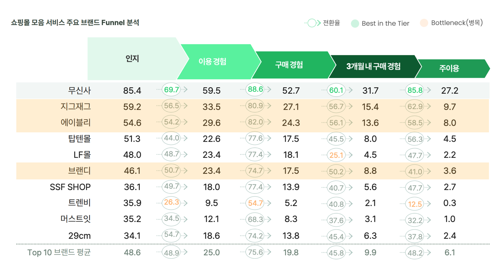 쇼핑에 있어서 퍼널은 보편적으로 "인지 > 흥미 > 검색 > 행동(구매) > 재구매" 단계로 전환됩니다. 아래는 오픈서베이에서 2022년 4월에 발행한 <mz세대 패션앱 트렌드 리포트>의 쇼핑몰 모음 서비스 주요 브랜드의 퍼널 분석입니다. 브랜디의 단계별 퍼널 수치가 지그재그, 에이블리와 비교해보면 전반적으로 낮습니다. 퍼널 전환율이 낮은 편은 아니지만 각 퍼널에서의 수치만 본다면 브랜디는 개인쇼핑몰 모음 앱 중에서는 꼴찌라고 볼 수 있습니다.